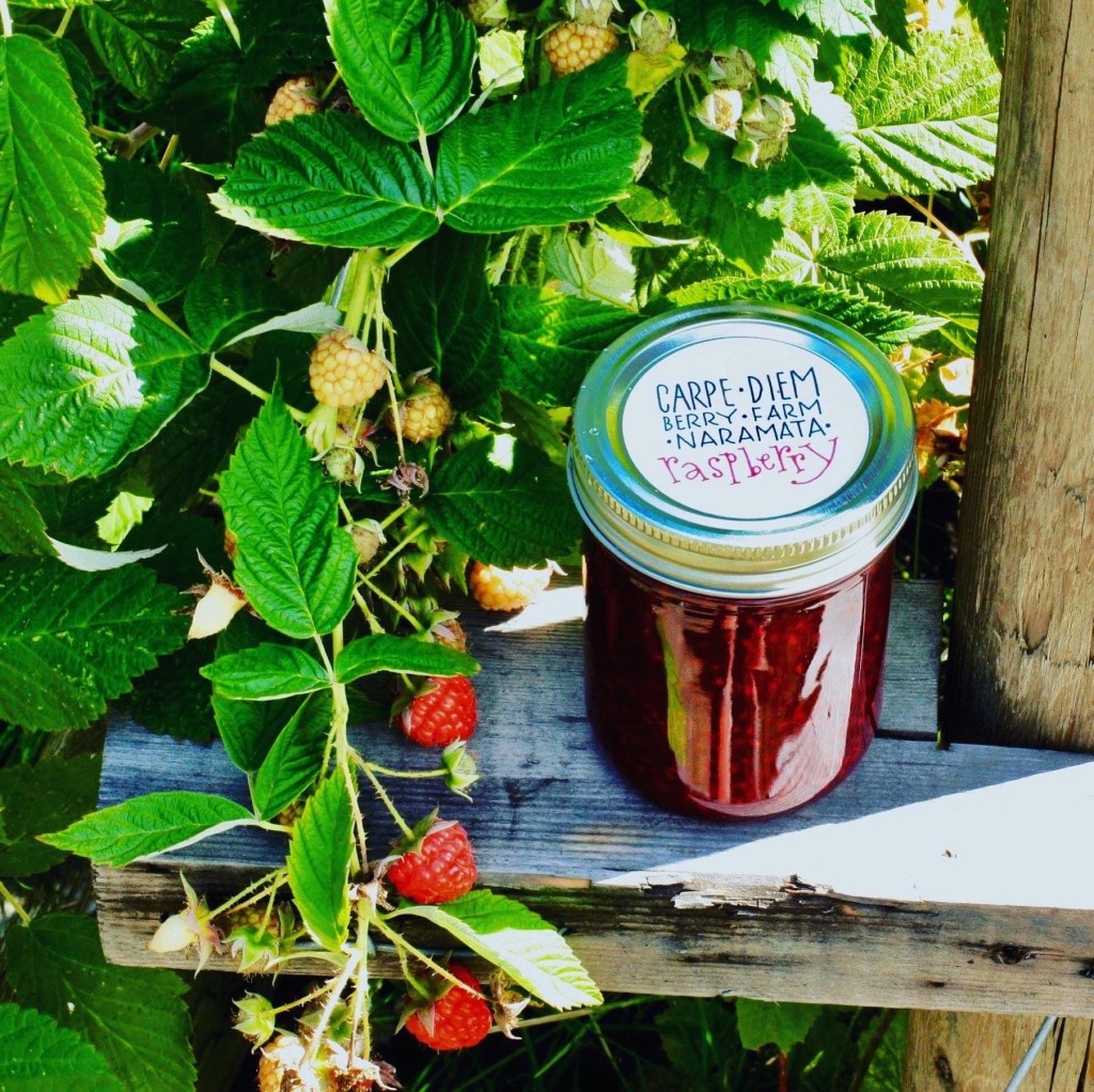 Each jar has a pint of fresh-picked organic raspberries from our farm which I would sell for $5.