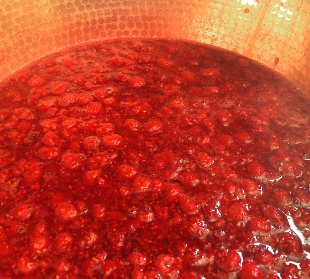 Raspberry jam from our farm-picked raspberries. From farm to jar in one day with only four ingredients.