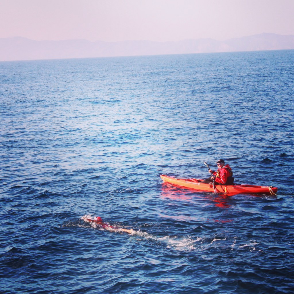 Brave Jan took the first shift from rocky Shakespeare Beach in the pitch black and stroked steadily for her hour. After a fumbling shift change (the boat is equipped with an elevator type device to re-board) I plunged in and felt calmer as my hour progressed. The jellies were EVERYWHERE but in the general crazy stress of the whole experience they became just a factor that could be largely ignored. The water felt cold but nothing I couldn’t handle.