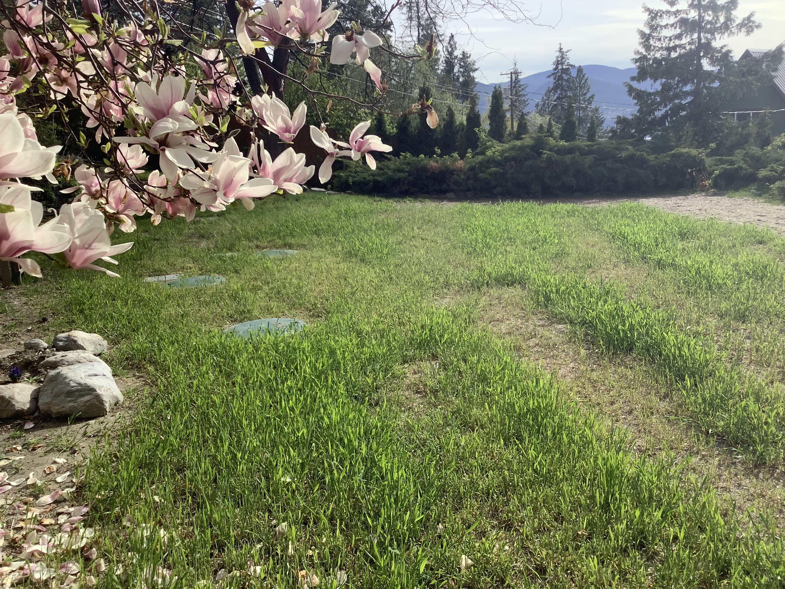 Our 2,500 square-foot traditional lawn that was watered, fertilized, aerated, and mown and mown and mown was the victim of a total failure of our old septic system. According to https://www.chapters.indigo.ca/en-ca/books/lawns-into-meadows-growing-a/9780998862378-item.html Owen Wormser, lawn mowing itself is a major source of pollution. Greenhouse gas emissions from mowing, along with fertilizer and pesticide production, watering, leaf blowing and other lawn management practices, were found by a University of California-Irvine study to be four times greater than the amount of carbon stored by grass. Lawns are an expensive, time-consuming ecological catastrophe.