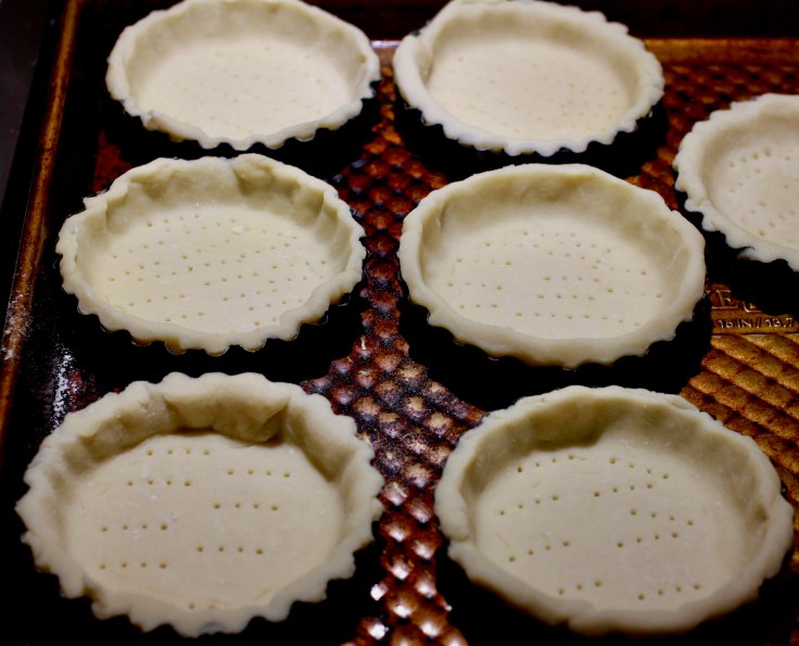 On a lightly floured surface, roll chilled dough out with a rolling pin to about ⅛-inch thick. With a fork, make small holes in the dough. Cut the dough into circles a about an inch wider than the pans, and then carefully transfer the circles to the pans, lightly pressing the dough into the edges. Roll a rolling pin over the top of the pans to remove any excess dough. Chill for at least 30 minutes.