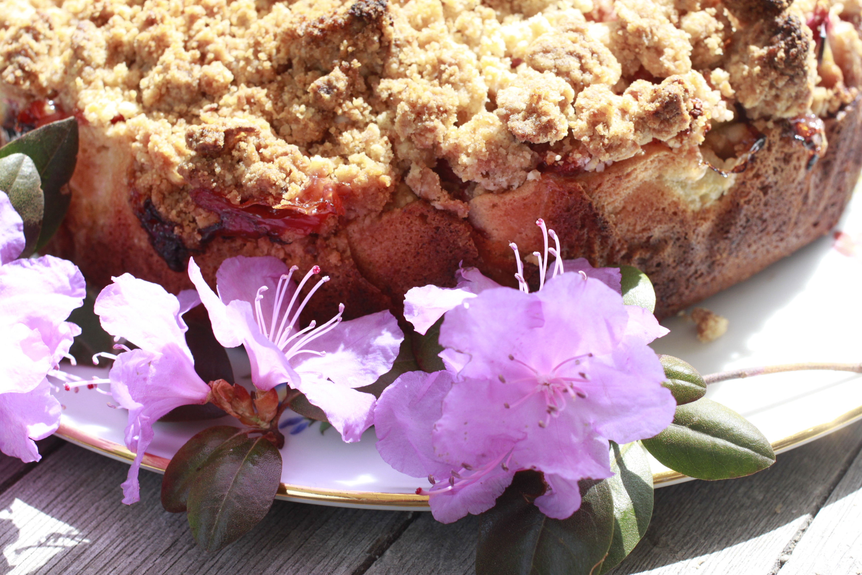 Pour the cake batter into the lined cake pan and smooth out the surface. Spoon over the fruit mixture and then sprinkle evenly with the crumble mixture.