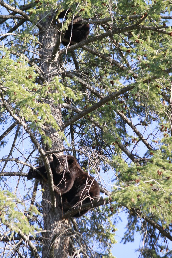 A medium-sized black bear, a three-year-old (neighbourhood regular) claws his way up a 40-foot pine making a hell of a racket. He has my attention. A few minutes later it becomes obvious that a much bigger black bear was the cause of his scramble. So now there are two bears up in the tree.